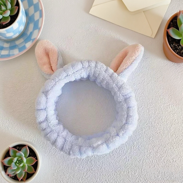 - Dùng hai tay kéo nhẹ băng đô và đội lên đầu sao cho phần tai thỏ nằm cố định phía trên.