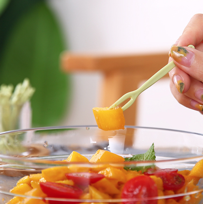 - Thiết kế nhỏ gọn, đầu nĩa 2 chấu giúp xiên thực phẩm dễ dàng mà không làm vỡ hoặc nát trái cây
