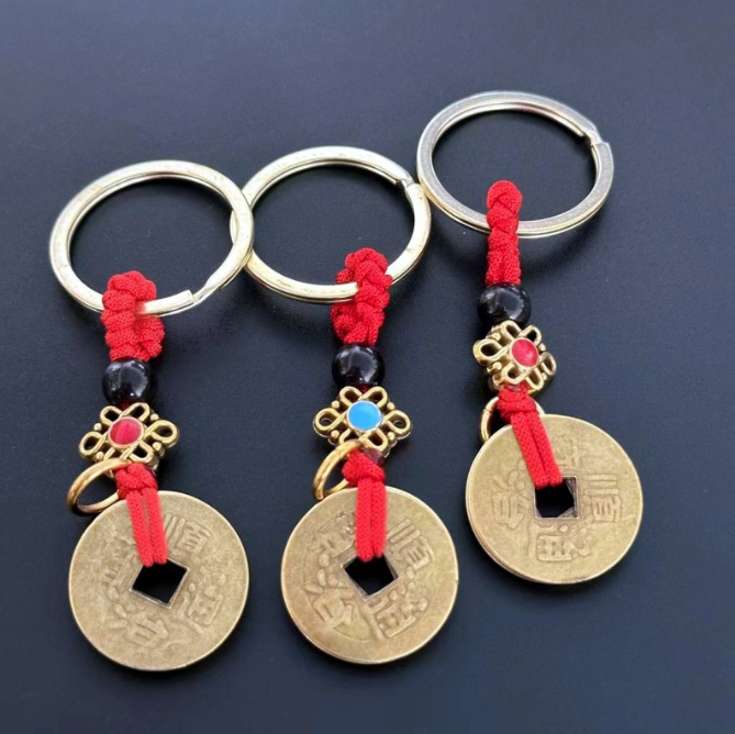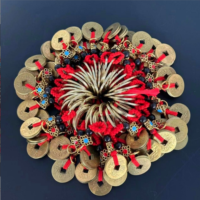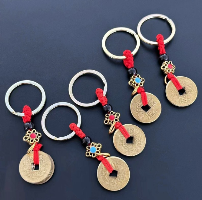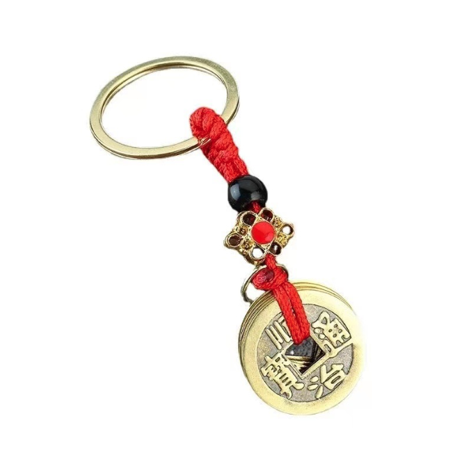 - Móc khóa phong thủy gồm 5 đồng xu cổ đi kèm dây thừng đỏ, tượng trưng cho Ngũ Hoàng Đế trong văn hóa Trung Hoa.