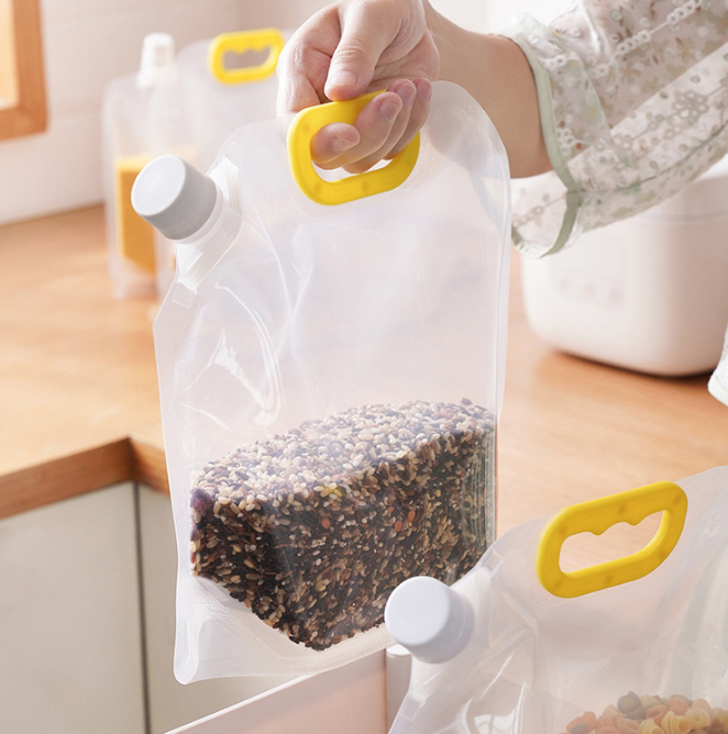 - Túi đựng ngũ cốc trong suốt thiết kế miệng vòi tiện lợi giúp rót gạo, đậu, hạt khô dễ dàng mà không bị đổ vãi.